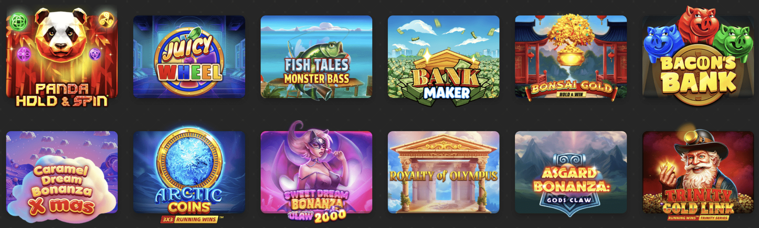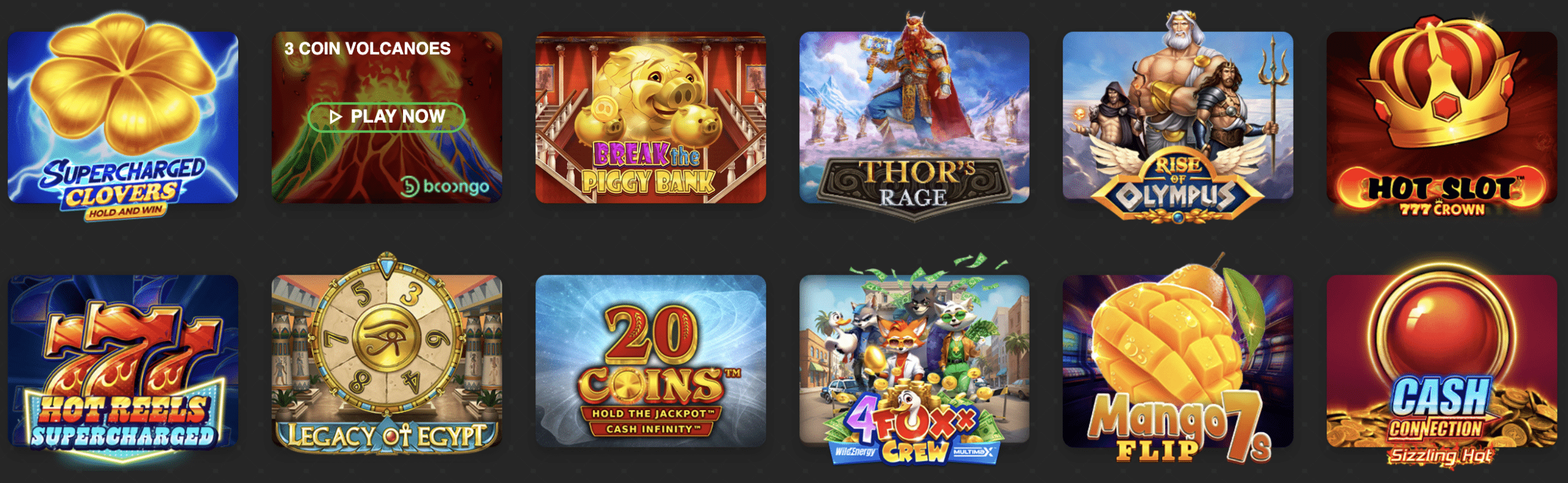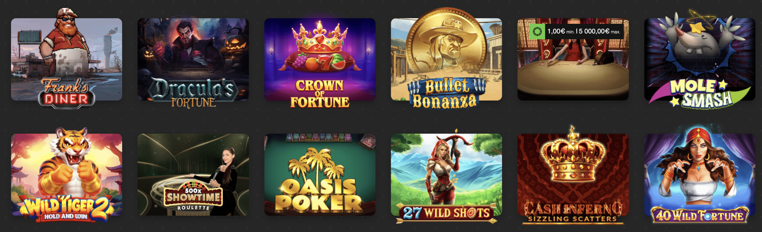 Côté jeux, le casino propose une bibliothèque vaste et variée, parmi laquelle on retrouve des machines à sous, des jeux de table (roulette, blackjack, poker), ainsi que des jeux en direct avec croupiers. Chaque titre proposé par le casino est développé par des fournisseurs parmi les plus reconnus de l’industrie, tels que NetEnt, Play’n GO, Betsoft ou encore Big Time Gaming.